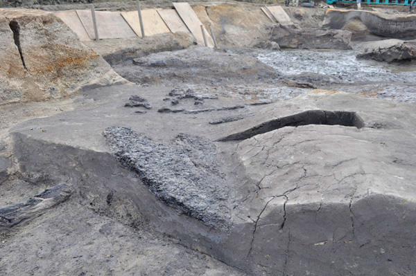 最も顕著な遺構は、下ッ道東側溝であるSD2001で、幅6~12メートル、深さ1.4~2メートルの大規模な溝で、内部には橋脚とみられる柱や、水をせき止めるしがらみ状の遺構もみつかっています。また溝の中から出土した遺物には、土馬や斎串などの祭祀にかかわるもののほか、ウマやウシなどの骨も認められます。この溝は、出土した遺物から奈良時代の8世紀中頃から9世紀前半頃まで機能していたと考えられます。